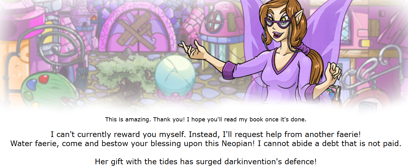 1. I can't currently reward you myself. Instead, I'll request help from another faerie! Fire faerie, come and bestow your blessing upon this Neopian! I cannot abide a debt that is not paid. She has stoked the fires inside Legretta_Abyss, who is stronger!