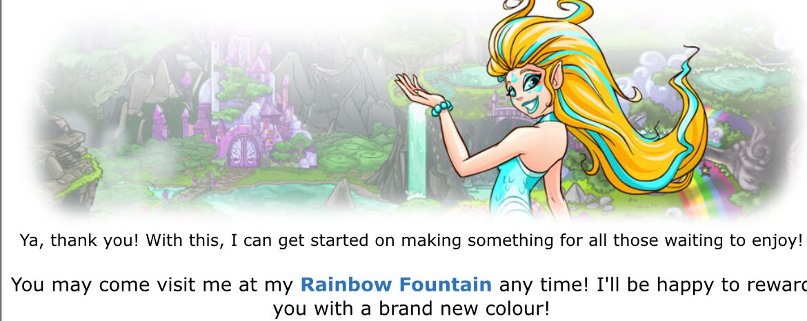 2. You may come visit me at my Rainbow Fountain any time! I'll be happy to reward you with a brand new colour! Well this just cancelled out the dip I got a few days ago. Since they are making all the changes to neo why not change the amount of dips we can have. I would like to stack them. 5 seems to be a good number but I would be happy with anything new.